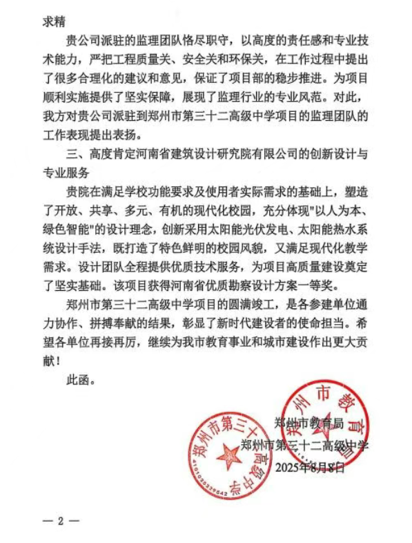 近日,由鄭州路橋建設(shè)投資集團(tuán)有限公司代建,由河南省院承擔(dān)設(shè)計(jì)工作的鄭州市第三十二高級(jí)中學(xué)項(xiàng)目圓滿竣工并順利通過(guò)驗(yàn)收。該項(xiàng)目自交付以來(lái),憑借卓越的設(shè)計(jì)品質(zhì),獲得了鄭州市教育局及校方的高度評(píng)價(jià)與一致認(rèn)可。作為鄭州市重點(diǎn)教育工程,該校將于今年秋季正式投入使用,屆時(shí)將迎來(lái)首批入學(xué)新生。該項(xiàng)目的成功落成,不僅標(biāo)志著鄭州市教育事業(yè)發(fā)展邁上新臺(tái)階,更有效優(yōu)化了二七區(qū)教育資源配置,為二七區(qū)教育現(xiàn)代化進(jìn)程注入了強(qiáng)勁動(dòng)力。