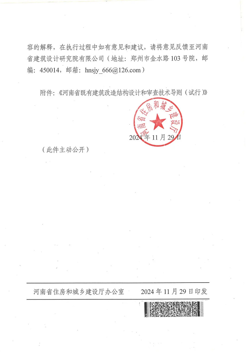 2024年11月29日,由河南省建筑設(shè)計(jì)研究院有限公司等單位編制的《河南省既有建筑改造結(jié)構(gòu)設(shè)計(jì)和審查技術(shù)導(dǎo)則(試行)》獲河南省住房和城鄉(xiāng)建設(shè)廳批準(zhǔn)并正式印發(fā)各地建設(shè)主管部門等有關(guān)單位。