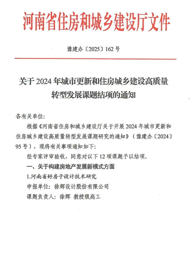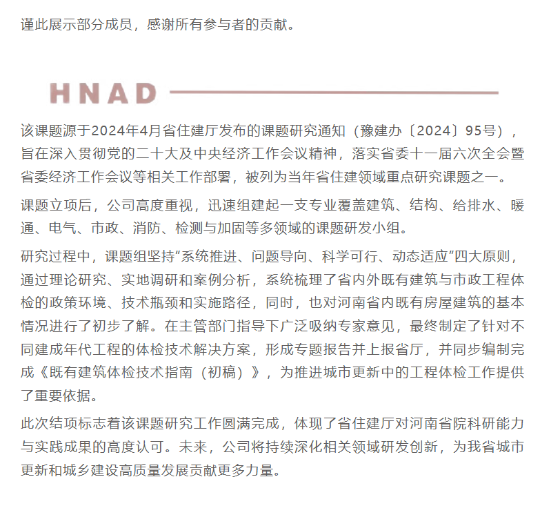 2025年8月,河南省住房和城鄉(xiāng)建設(shè)廳印發(fā)《關(guān)于2024年城市更新和住房城鄉(xiāng)建設(shè)高質(zhì)量轉(zhuǎn)型發(fā)展課題結(jié)項的通知》(豫建辦〔2025〕162號),正式公布課題評審結(jié)果。河南省院申報的《河南省既有建筑及市政工程體檢研究》課題經(jīng)專家嚴格評審,順利通過驗收,成功結(jié)項。