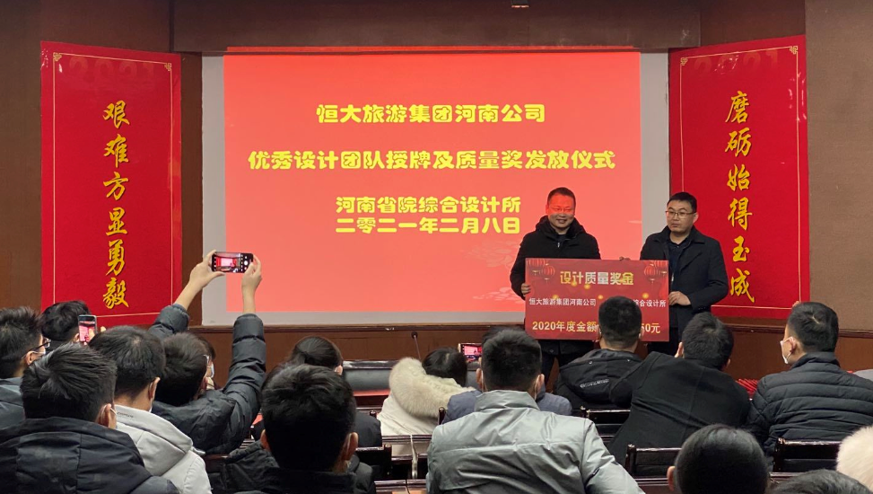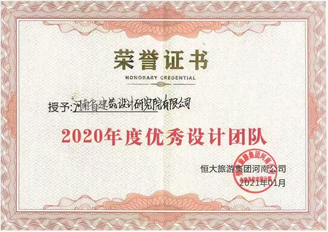 2021年2月8日,公司收到來(lái)自恒大旅游集團(tuán)河南公司總工室發(fā)來(lái)的表彰決定,對(duì)我公司綜合設(shè)計(jì)所2020年度的合作給予了高度的肯定,授予我公司綜合設(shè)計(jì)所“2020年度優(yōu)秀設(shè)計(jì)團(tuán)隊(duì)”榮譽(yù)稱(chēng)號(hào)。對(duì)項(xiàng)目組中工作表現(xiàn)突出的李付芹等幾位同志進(jìn)行通報(bào)表?yè)P(yáng)。