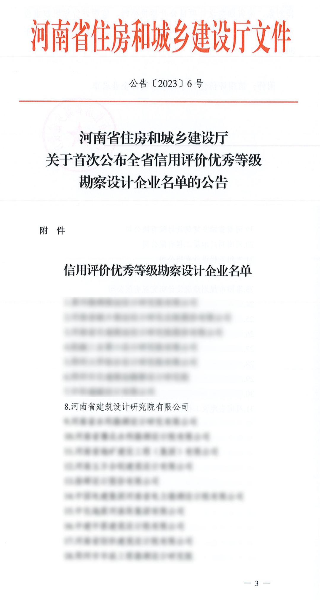 2023年2月10日,河南省住房和城鄉(xiāng)建設(shè)廳發(fā)布〔2023〕6號公告,首次公布全省信用評價優(yōu)秀等級勘察設(shè)計企業(yè)名單,河南省建筑設(shè)計研究院有限公司榮膺首批信用評價優(yōu)秀等級企業(yè),入選企業(yè)相關(guān)信息可在河南省建筑市場監(jiān)管公共服務(wù)平臺查詢。