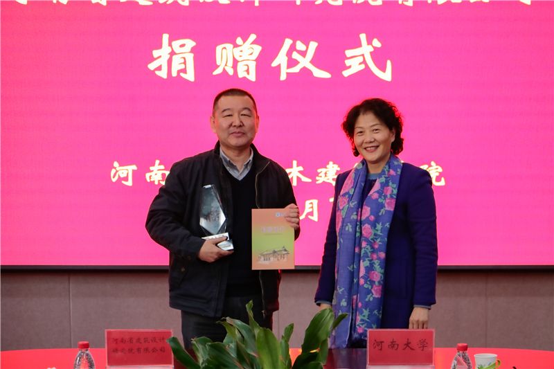 儀式上,河南省建筑設(shè)計(jì)研究院有限公司總工程師蔡黎明代表公司簽訂了捐贈(zèng)協(xié)議,并接受了捐贈(zèng)證書和紀(jì)念杯;河南大學(xué)土木建筑學(xué)院黨委書記李社教接受捐贈(zèng)。公司財(cái)務(wù)總監(jiān)韓兆海接受了河南大學(xué)土木土木建筑學(xué)院院長(zhǎng)岳建偉代表學(xué)校回贈(zèng)的“八駿追夢(mèng)”圖。