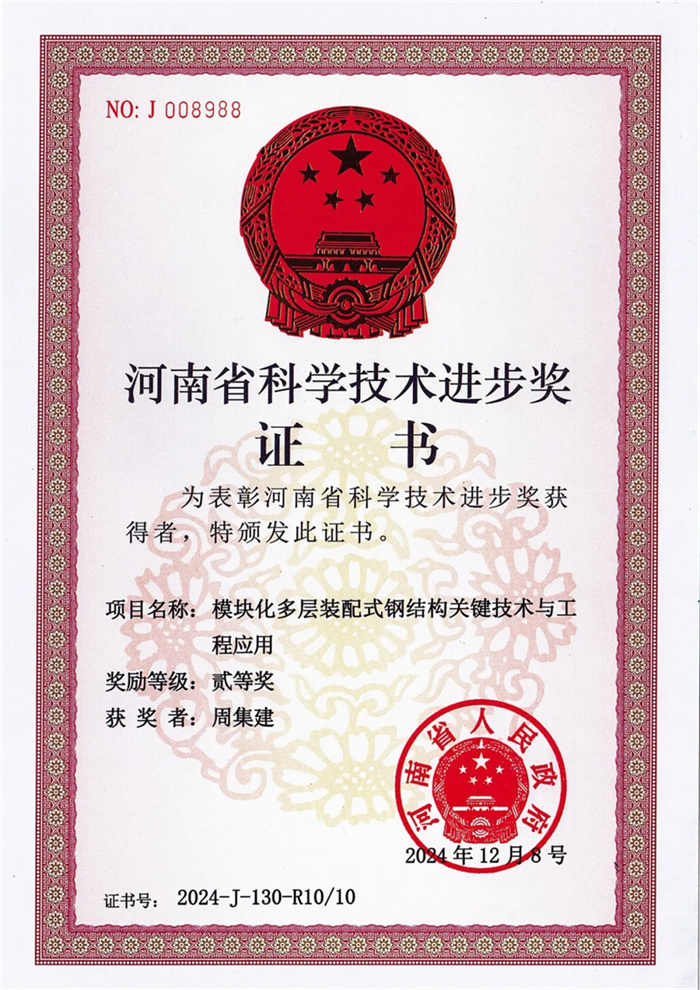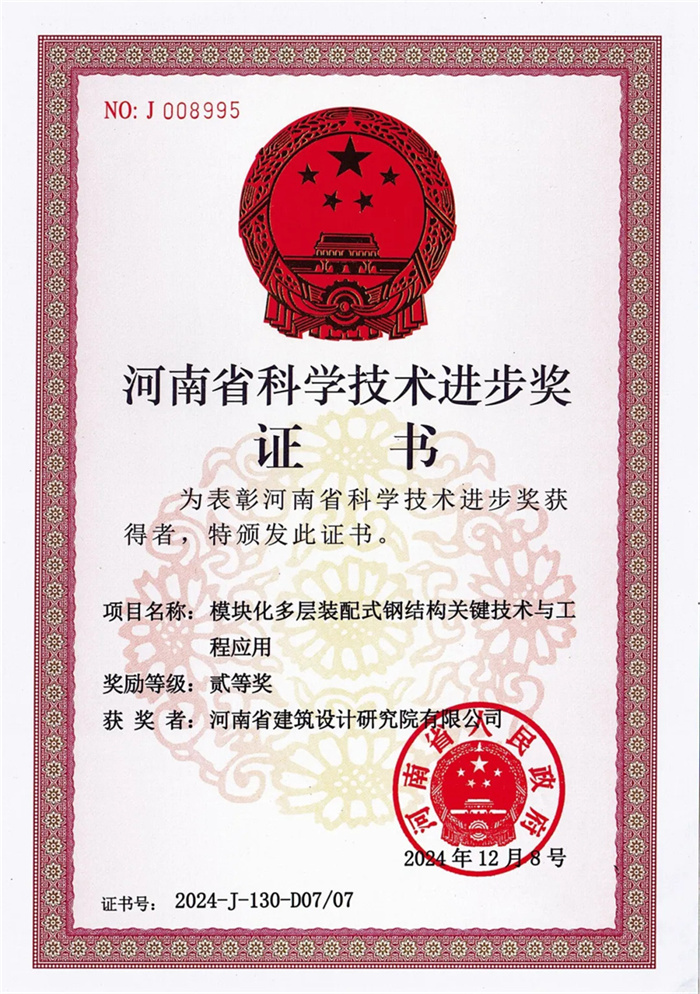 2024年12月11日,河南省人民政府公布關于2024年度河南省科學技術獎勵的決定,我公司參與完成的《模塊化多層裝配式鋼結構關鍵技術與工程應用項目》,獲得河南省科學技術進步獎二等獎!