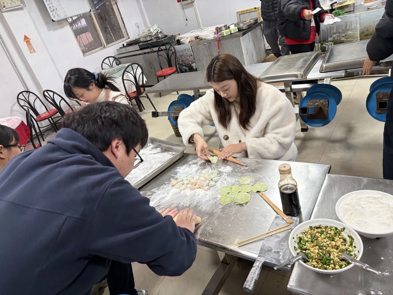 活動中,大家自發(fā)組隊,協(xié)作配合。取皮、填餡、捏合,動作嫻熟,笑語不斷。不一會兒,桌面上便擺滿了造型多樣的餃子,有月牙彎彎,也有創(chuàng)意團團,每個餃子都包進了心意與祝福。