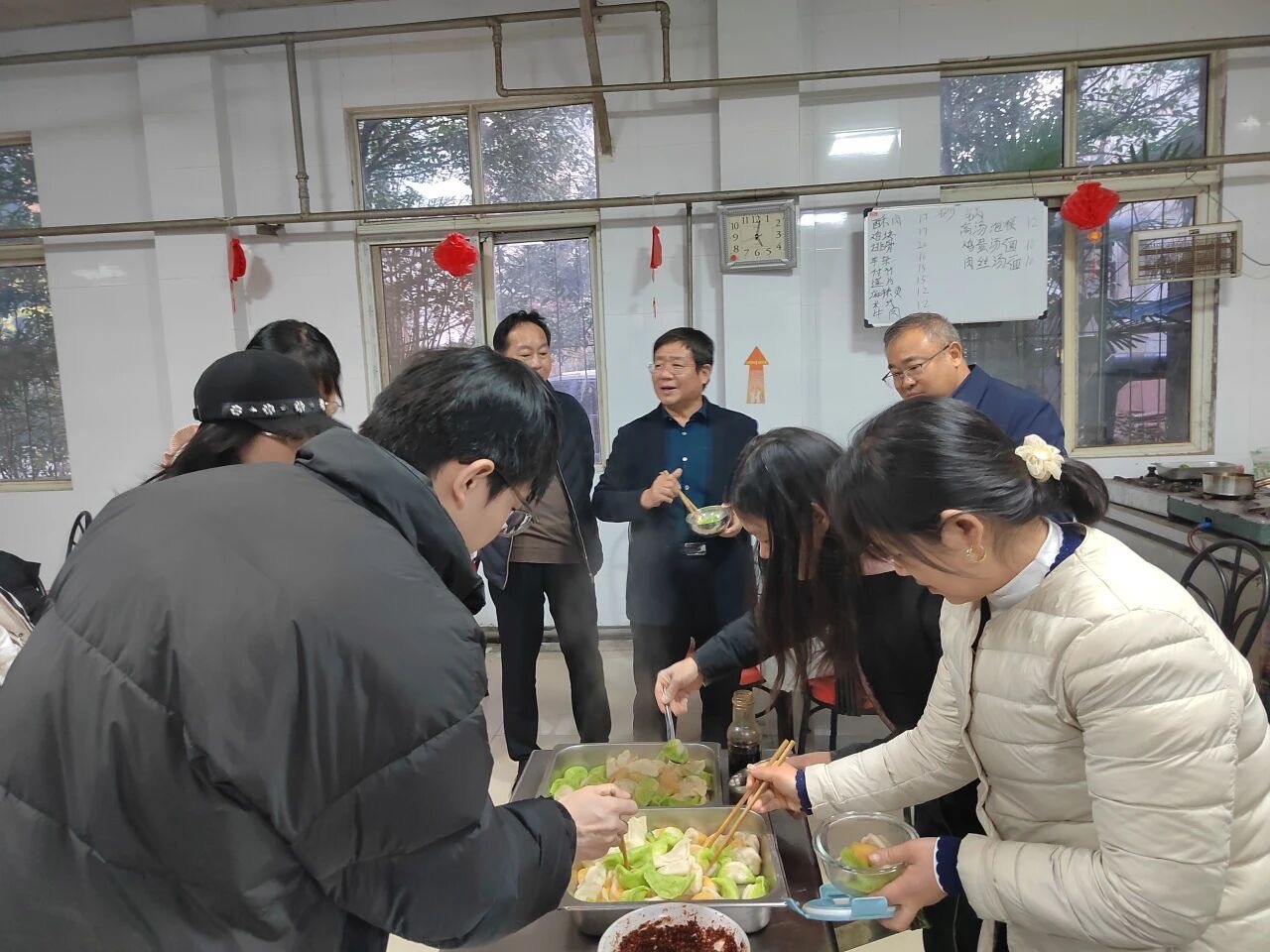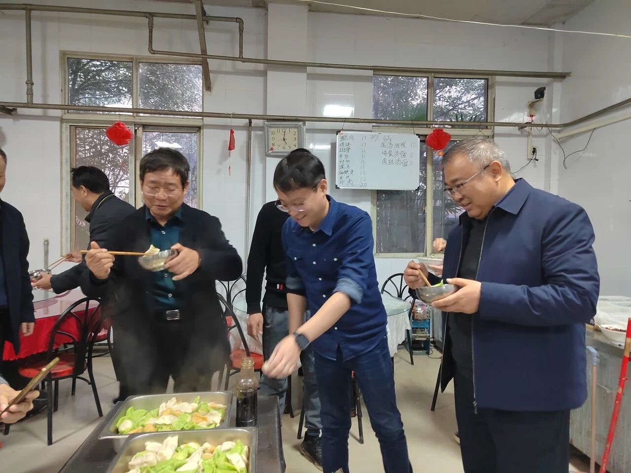 熱氣騰騰的餃子出鍋后,香氣滿堂。公司董事長、總經(jīng)理、總建筑師鄭彥凱,公司黨委書記、董事、財務總監(jiān)韓兆海代表公司管理層與員工圍坐一起,共享勞動成果,暢聊生活趣事。