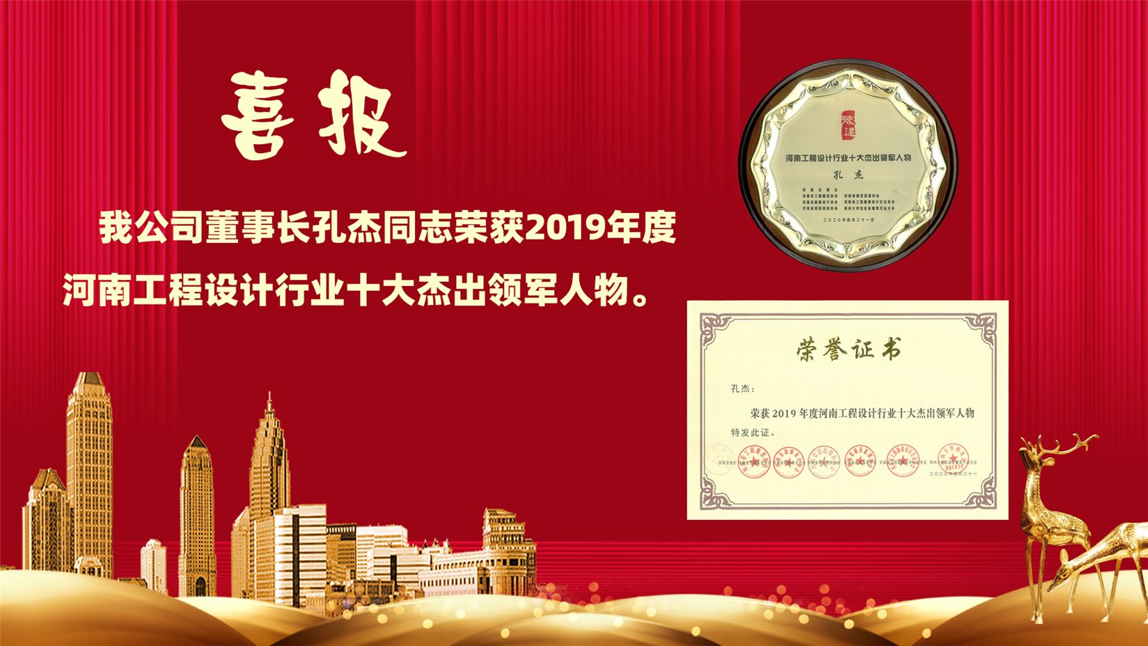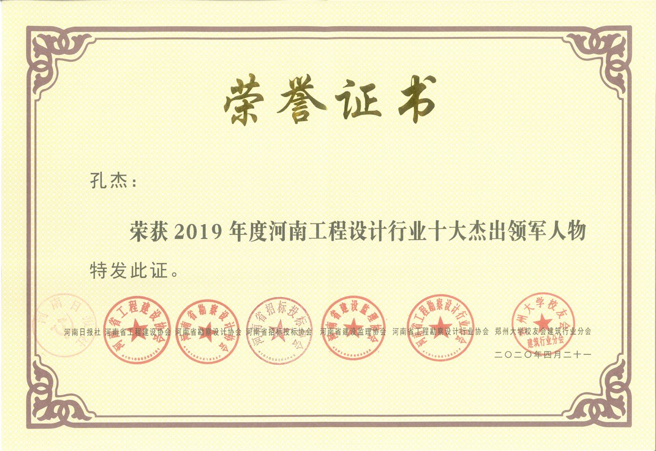 董事長(zhǎng)孔杰同志榮獲2019年度河南工程設(shè)計(jì)行業(yè)十大杰出領(lǐng)軍人物